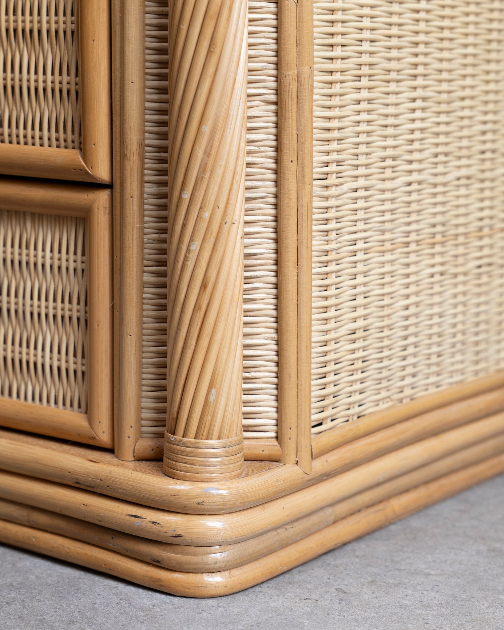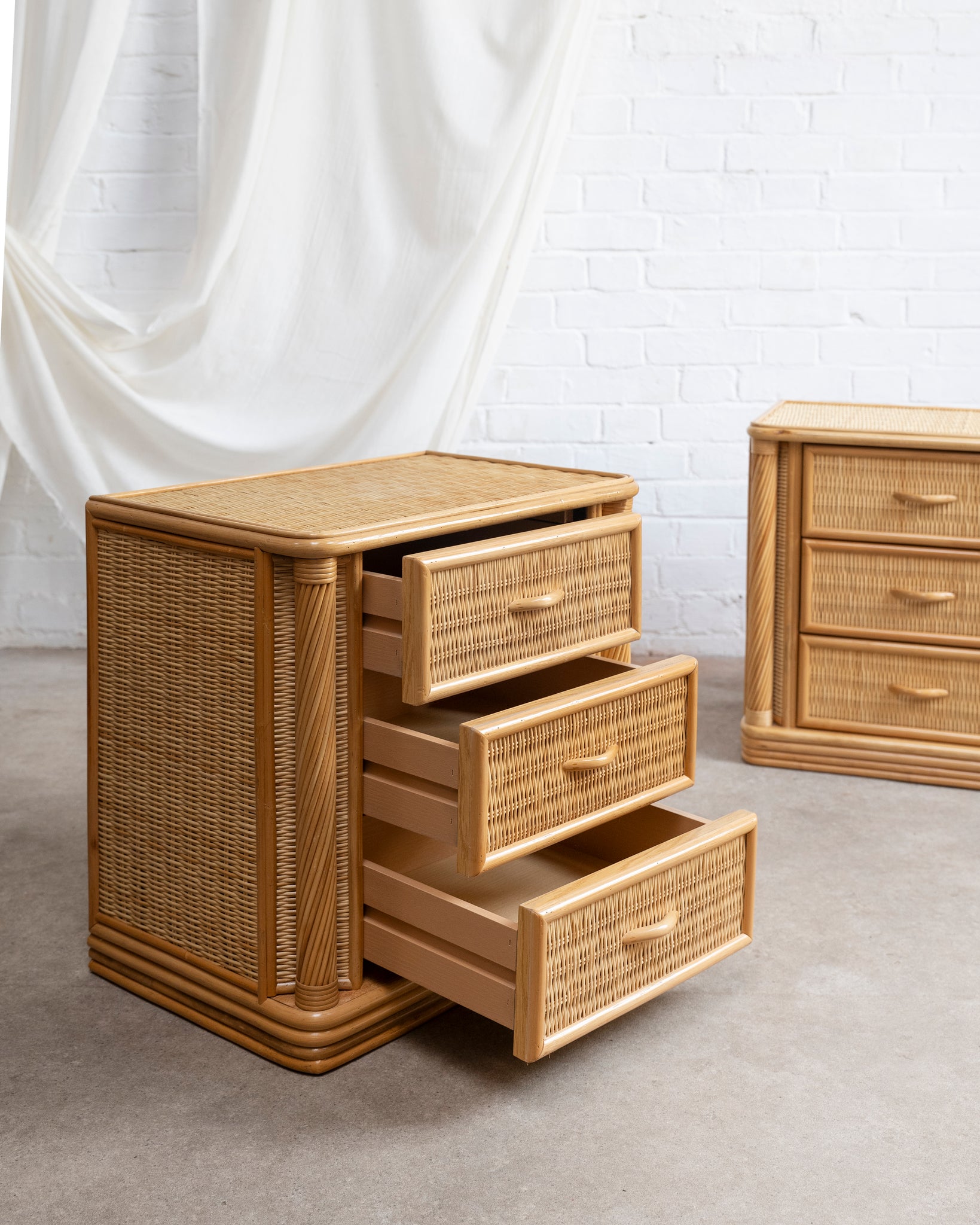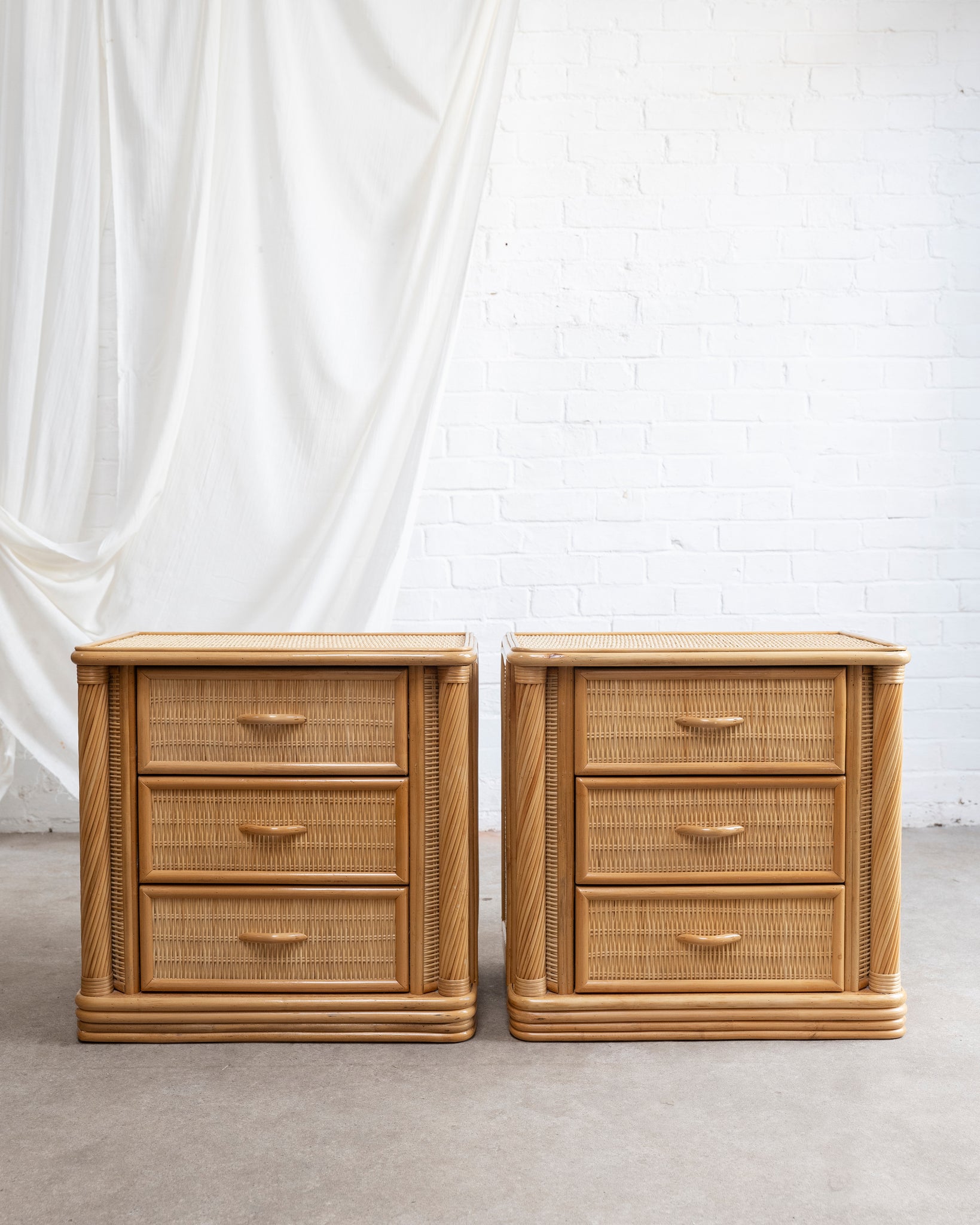 A quality set of pencil reed and cane bedside tables with three drawers and pencil reed columns.