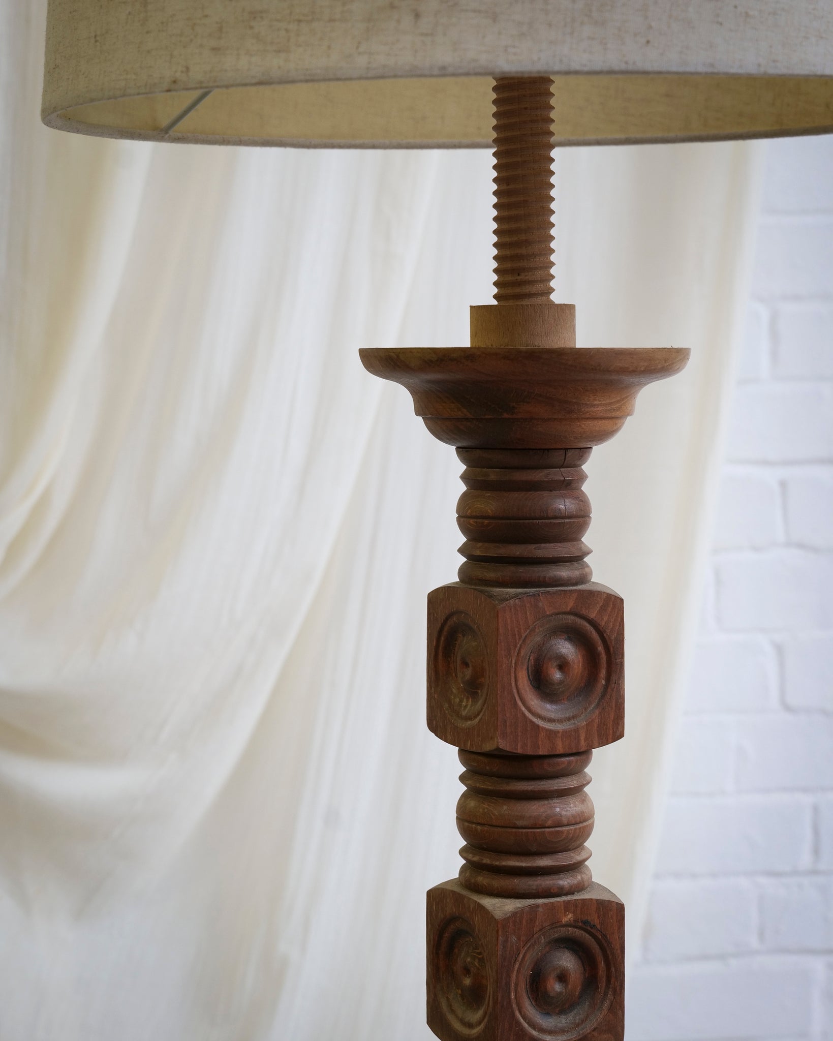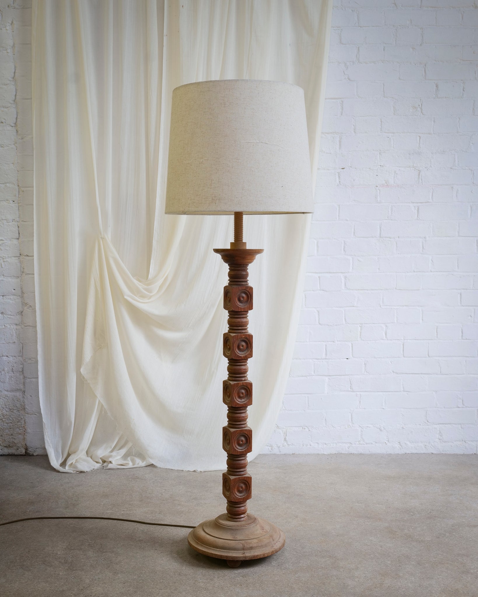 Charles Dudouyt attributed standing floor lamp with intricately carved concentric circular base.