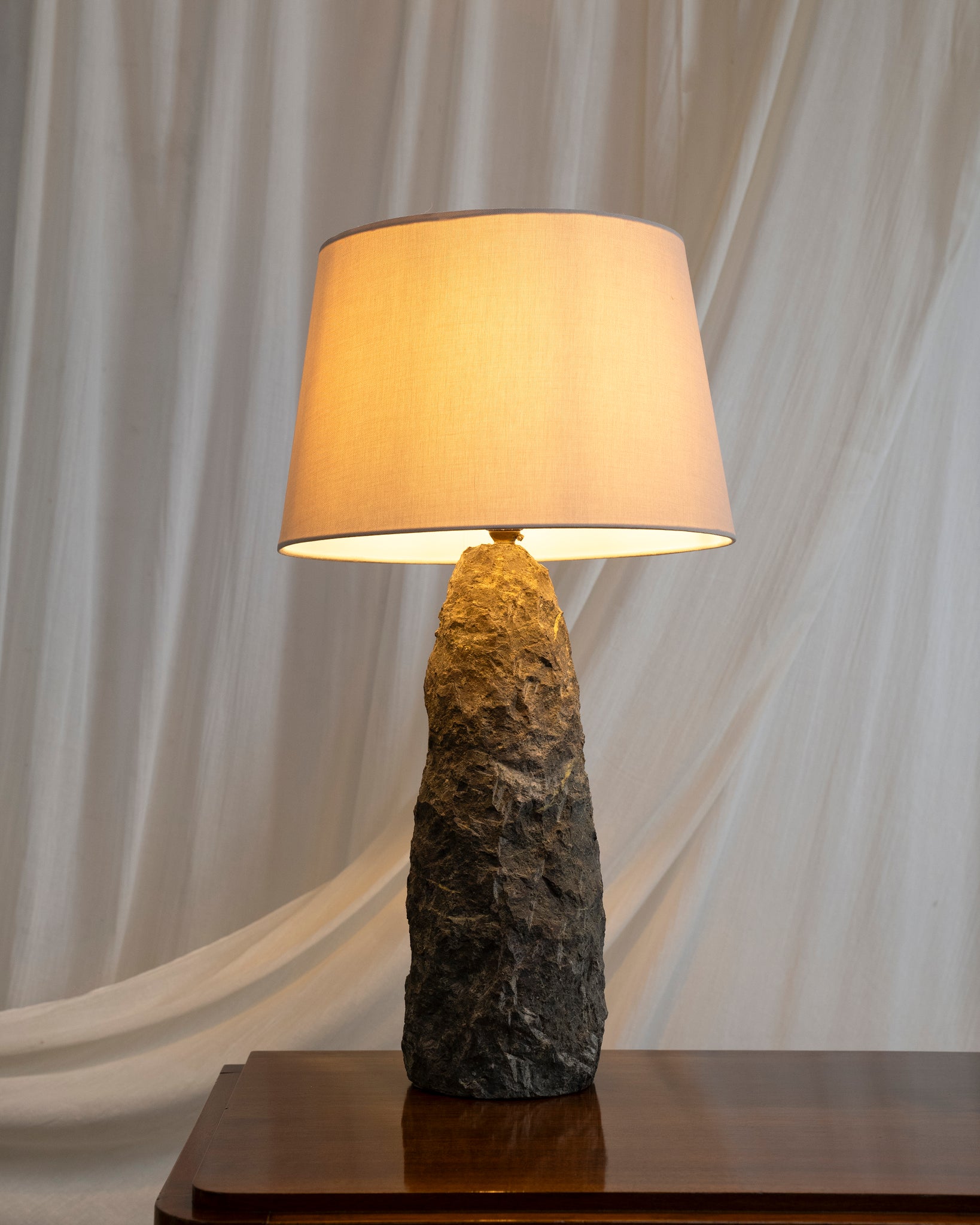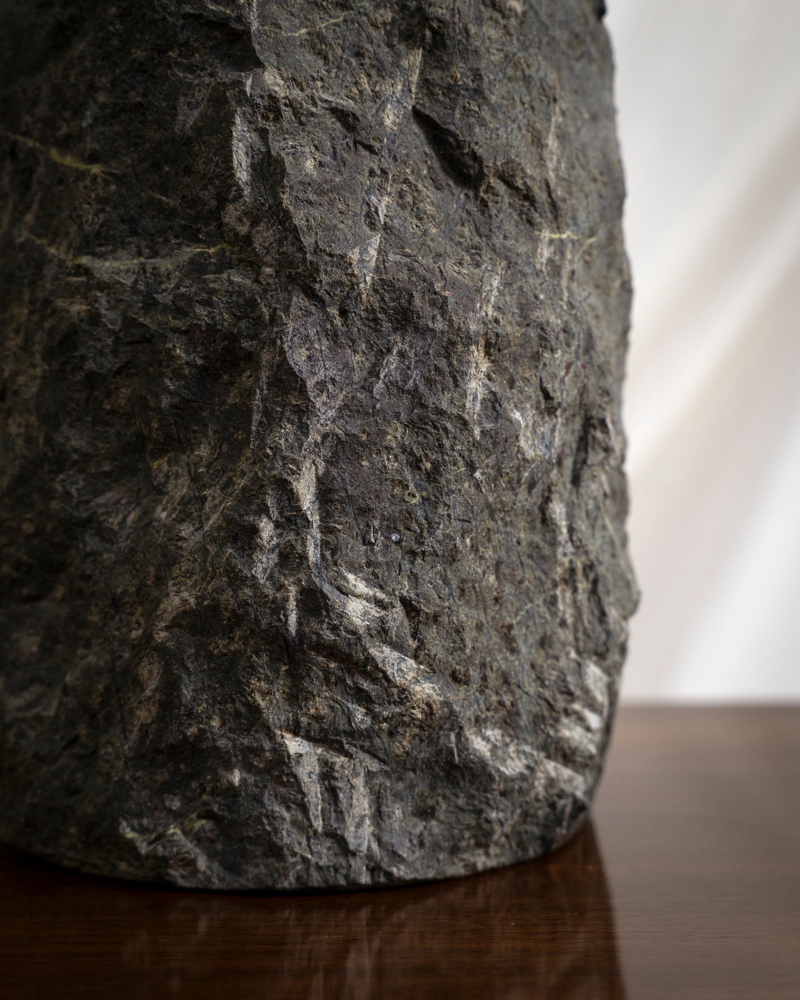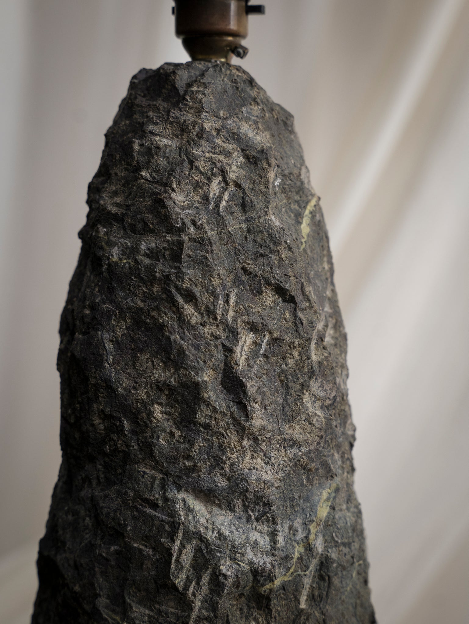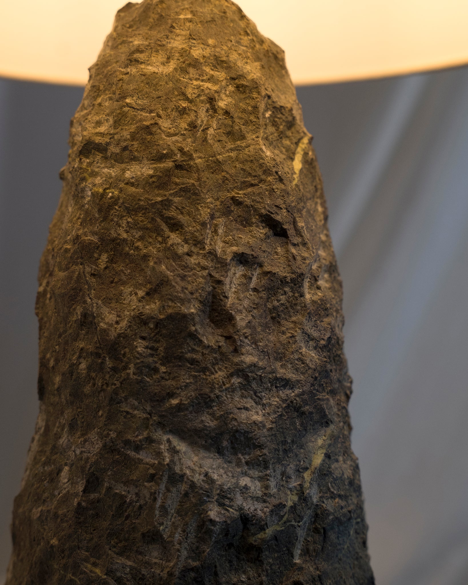 This rustic form lamp is a natural beauty, with light veining throughout the heavy rock.