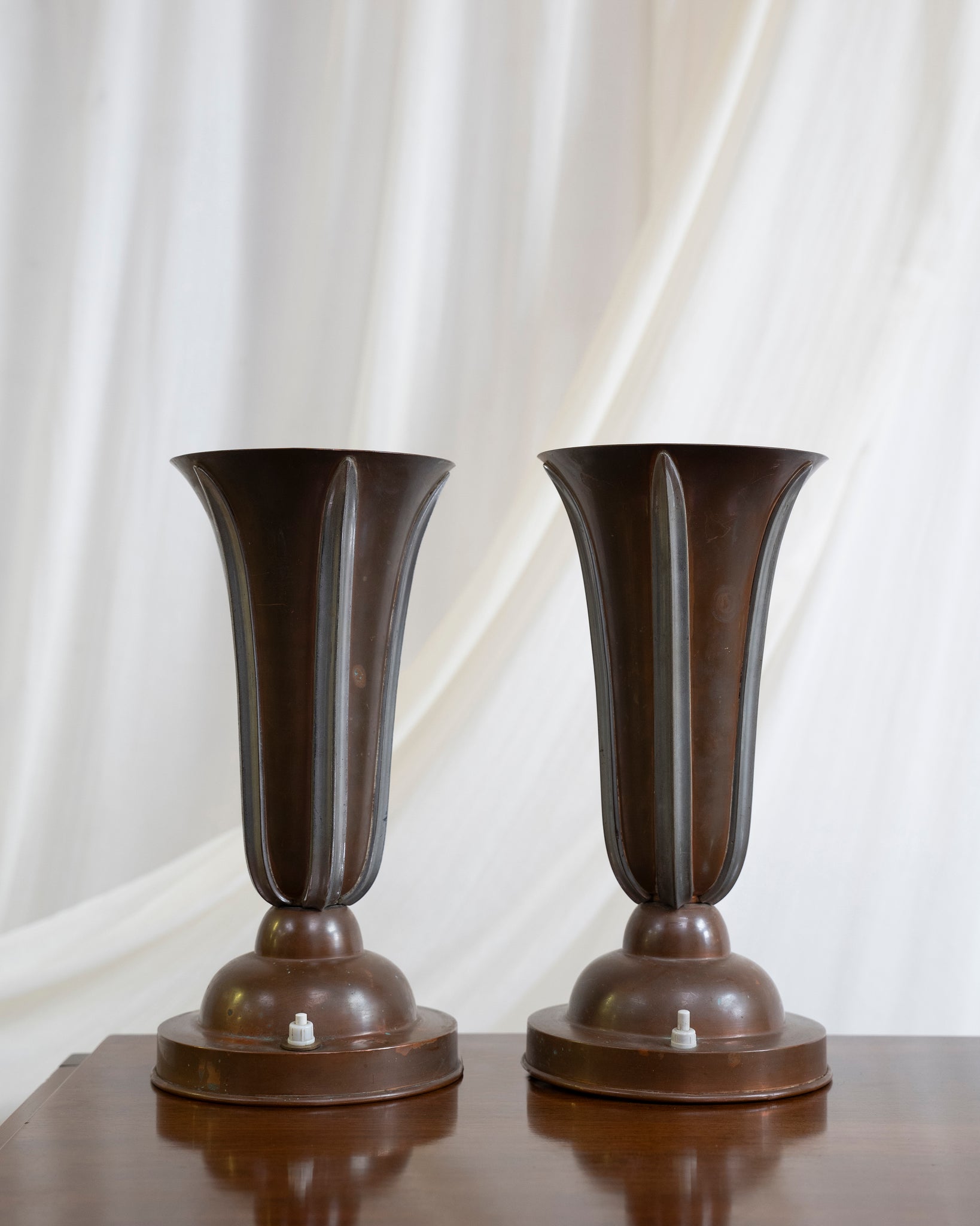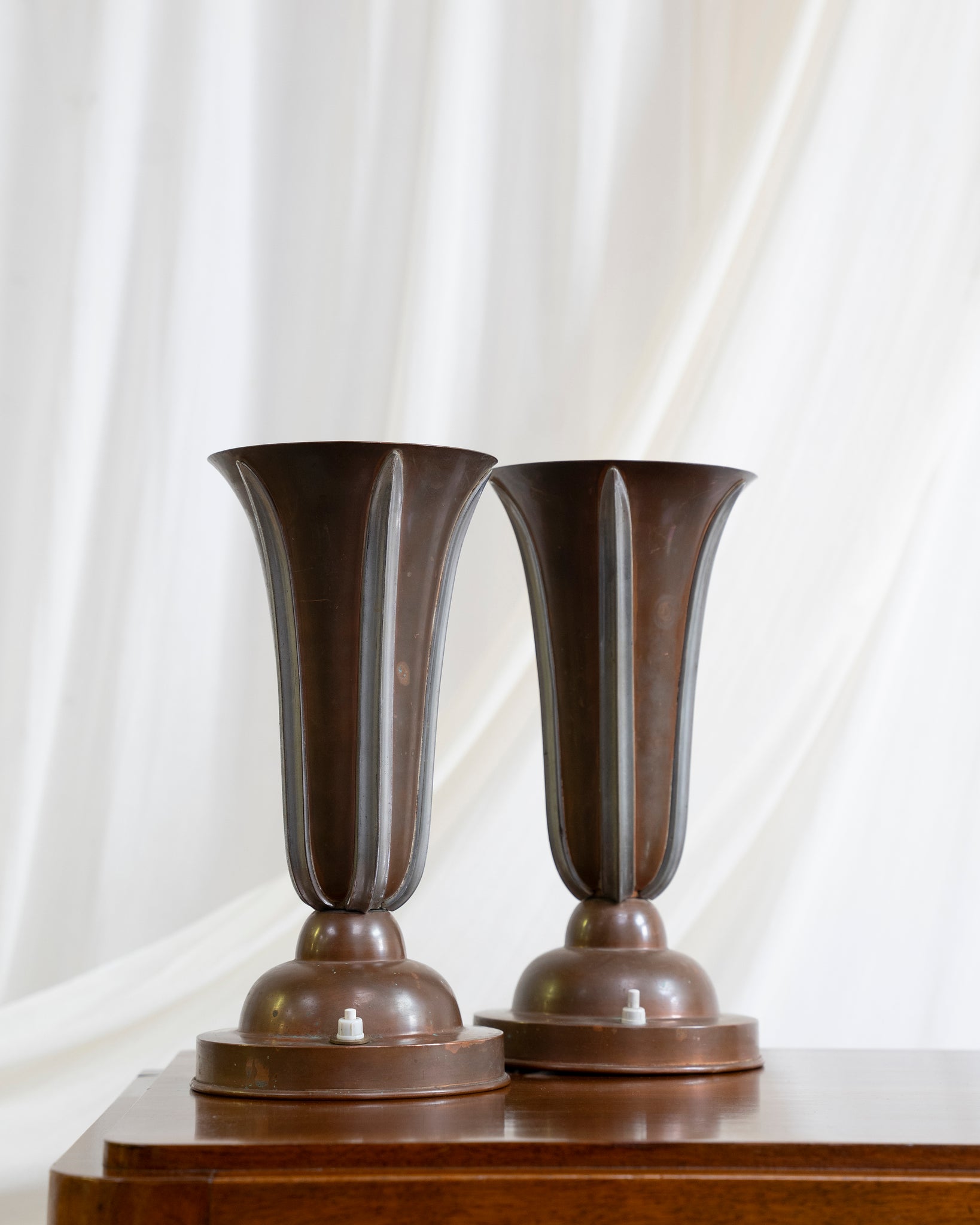 A Pair of elegant French copper and chrome lamp in a classic Art Deco design. Emits a warm, ambient glow.