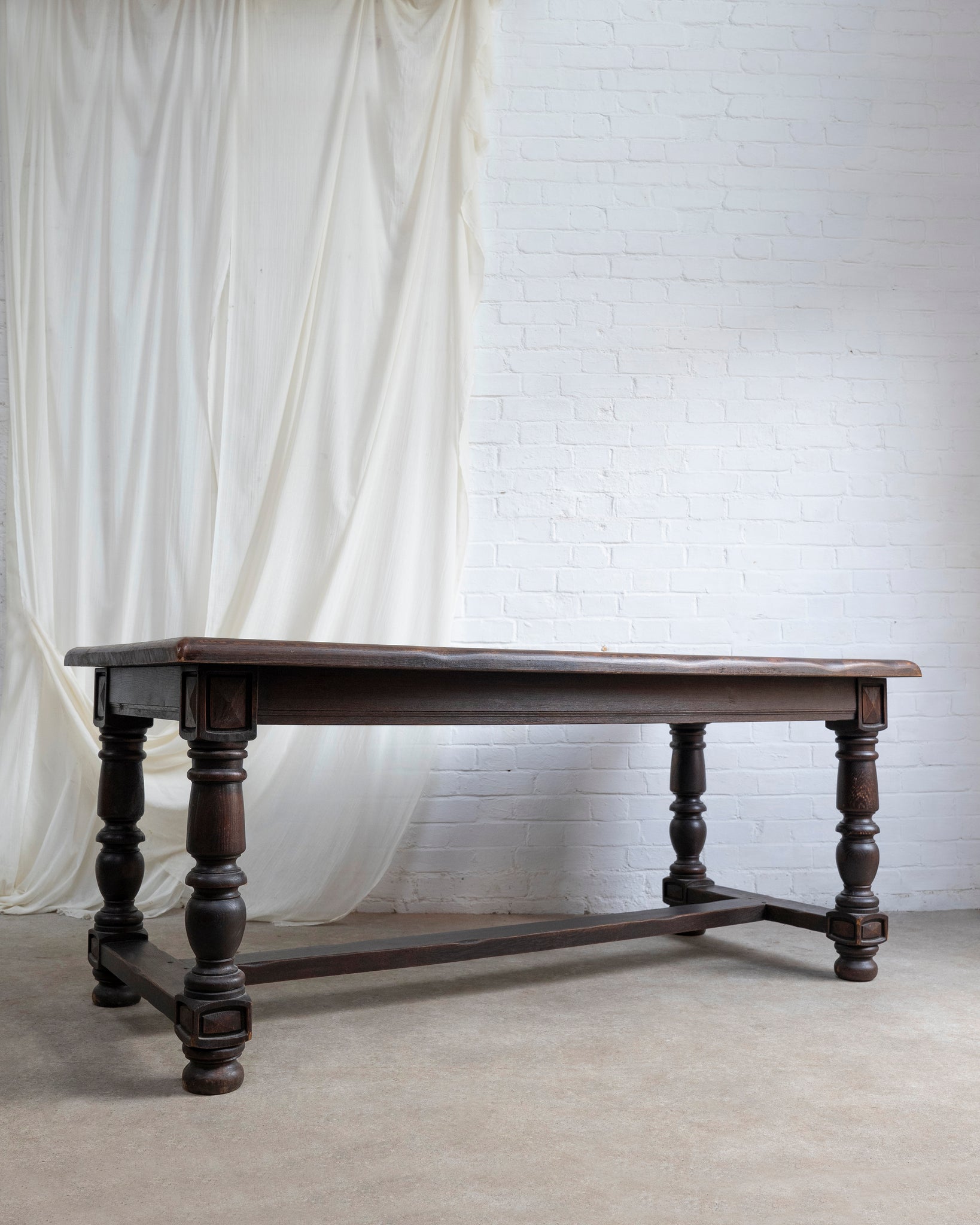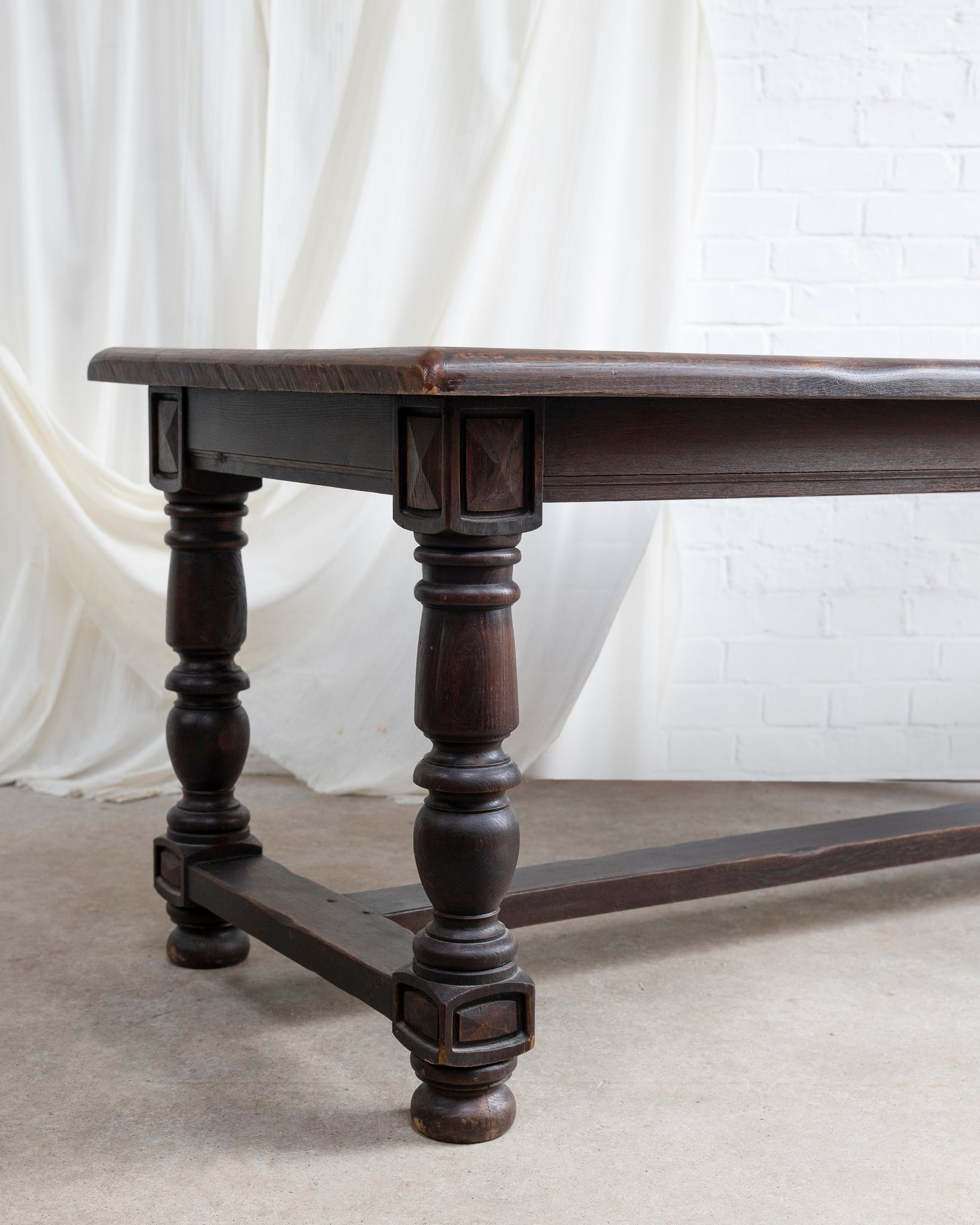 A fantastic solid Oak Brutalist Spanish dining table, featuring carved motif on the legs and under the base. The top has soft curved corners with a slightly organic soft edge.