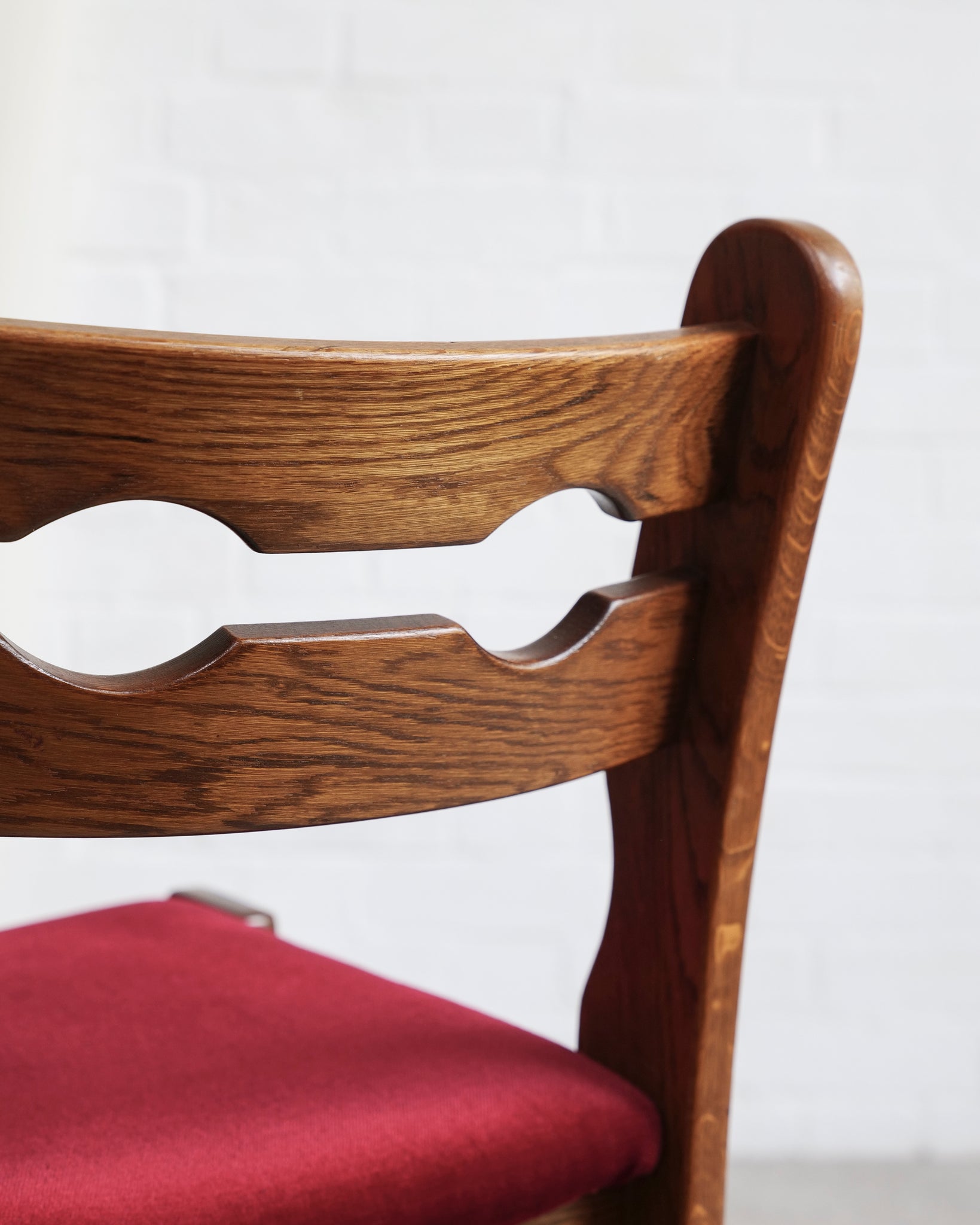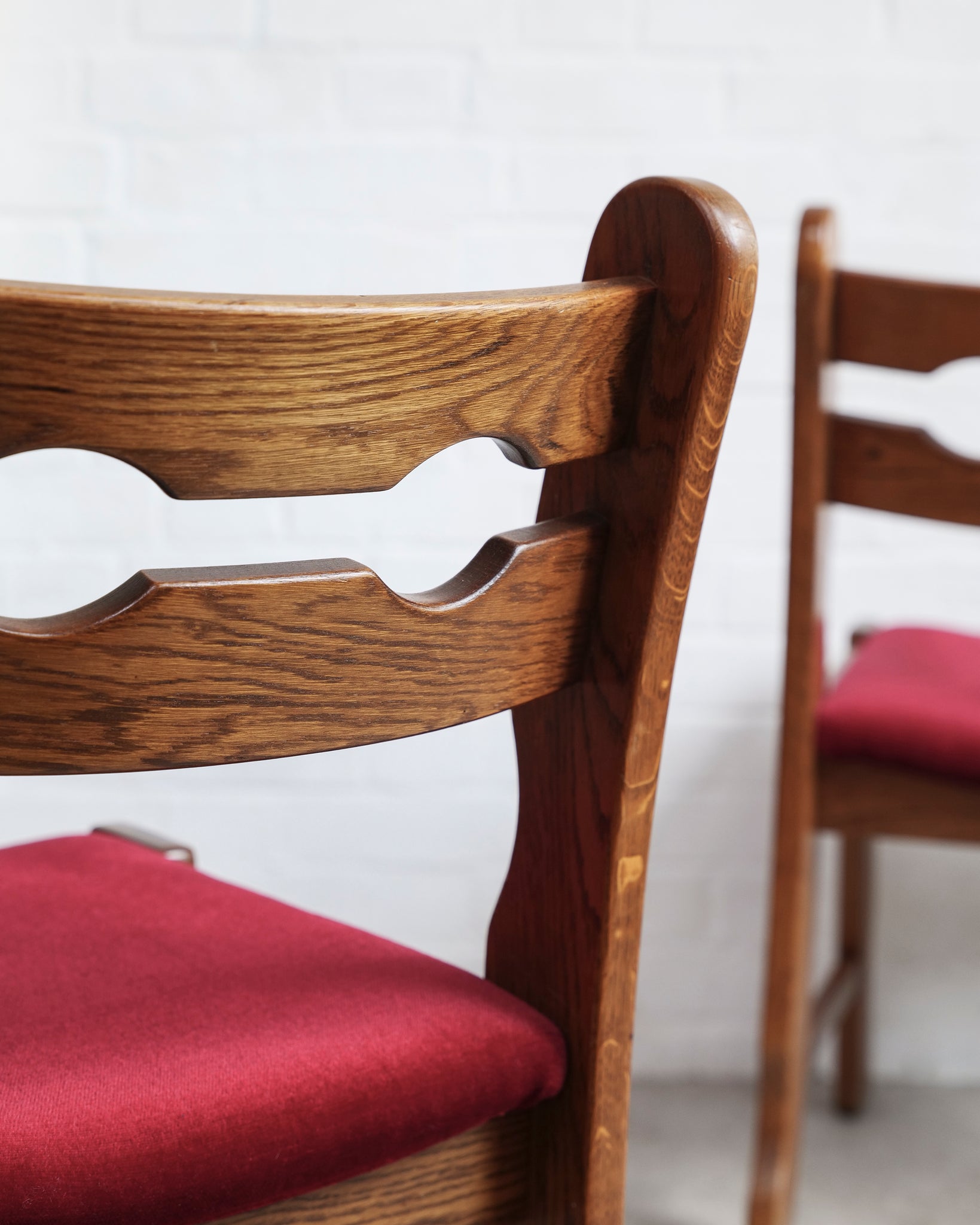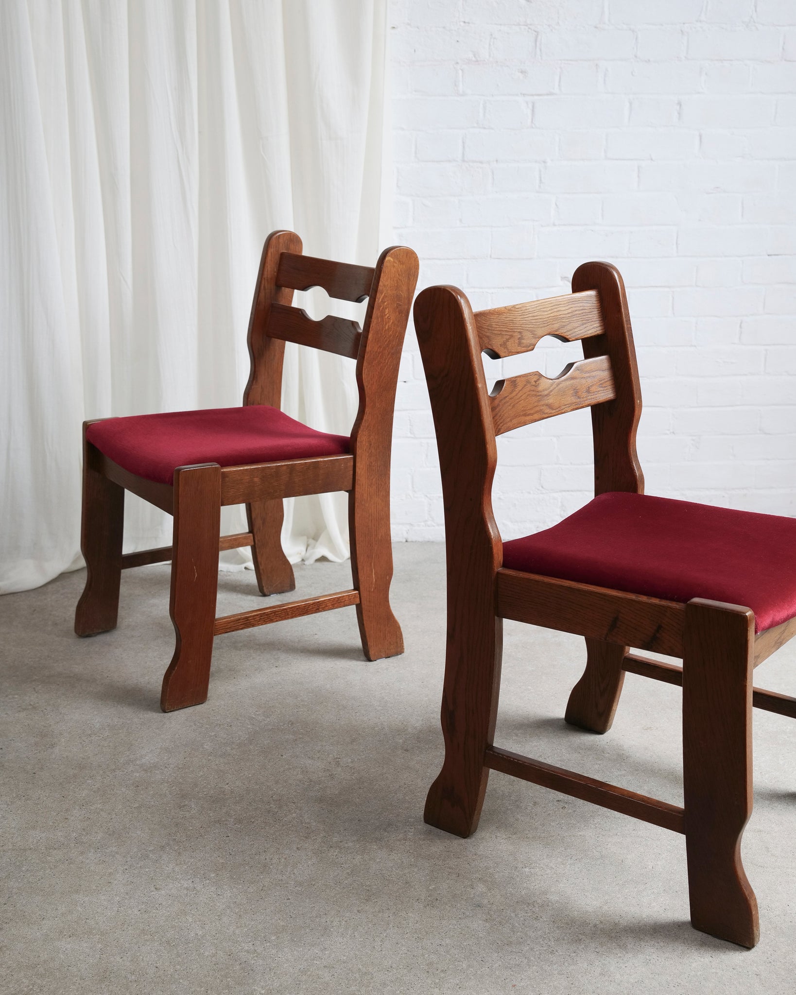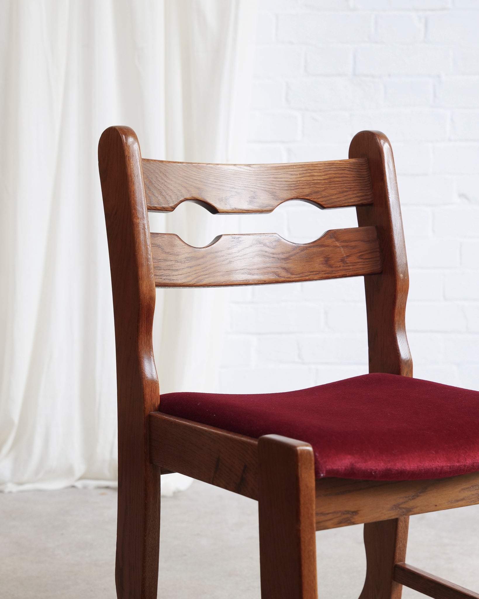 A beautiful set of dark oak razor-back dining chairs. This set still has the original upholstery in a deep dark red velvet. The fabric is in great condition, with minimal wear.