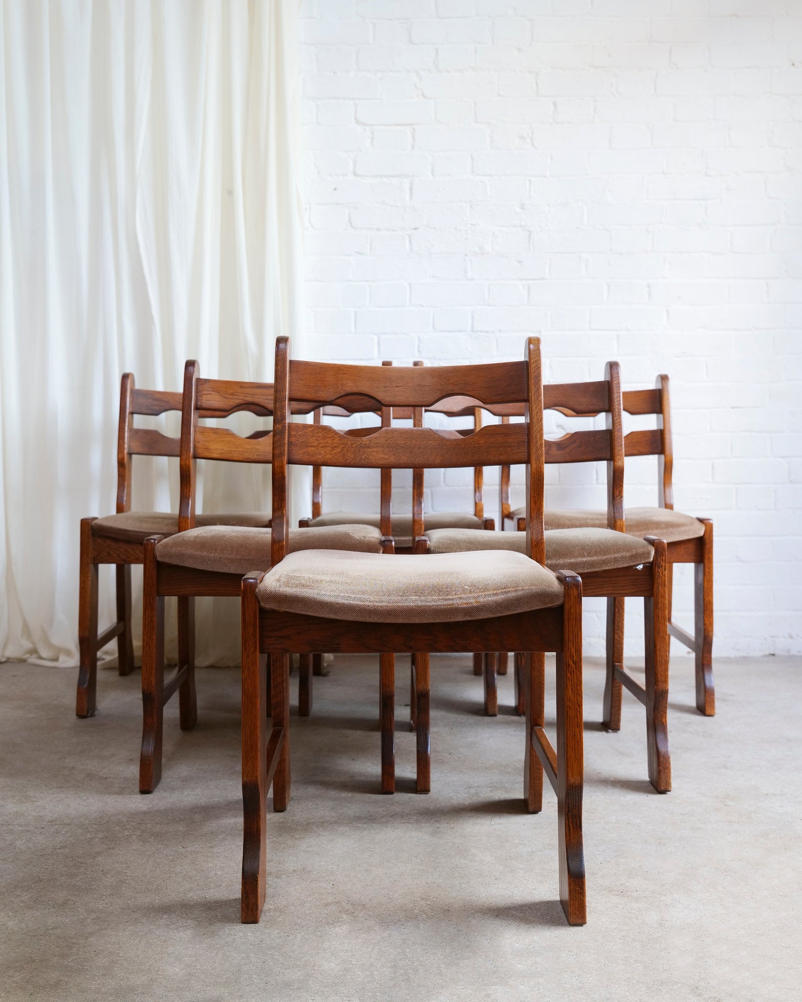 A beautiful set of oak razor-back dining chairs. This set still has the original upholstery in a light brown velvet. The fabric is in great condition, with minimal wear.