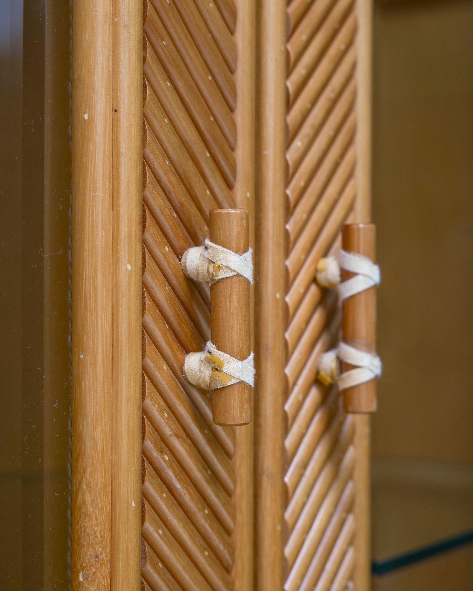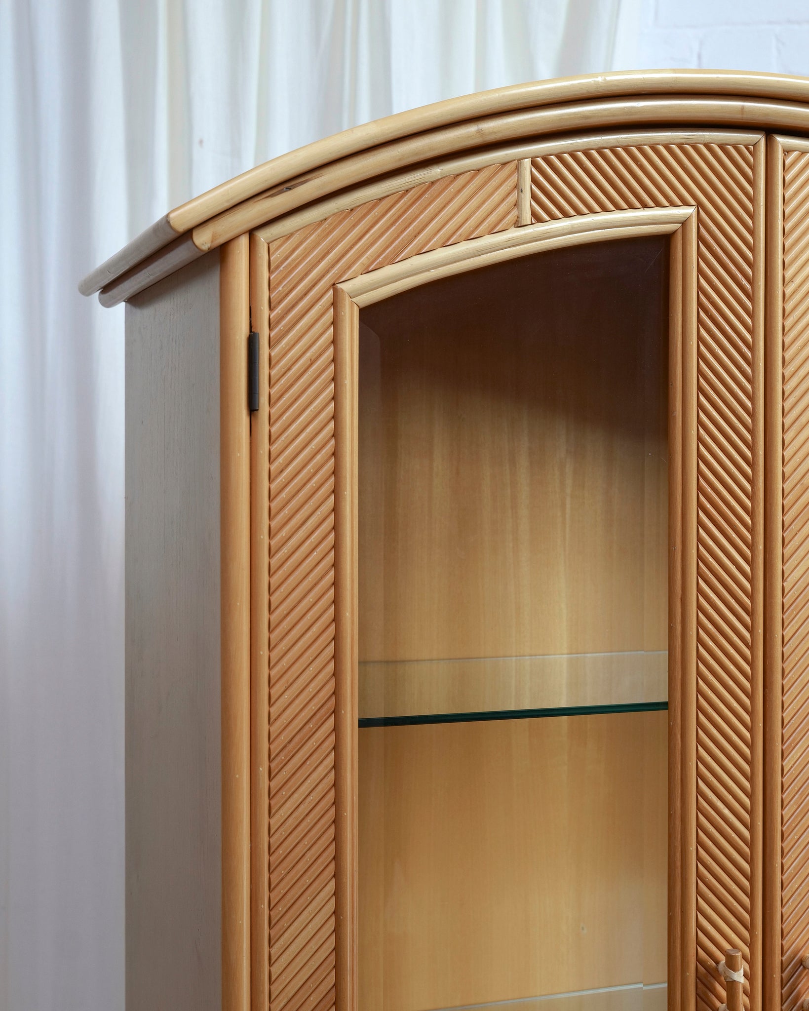 A stunning glass fronted chunky pencil reed cabinet, with bamboo handles and lather trimmed finishes.