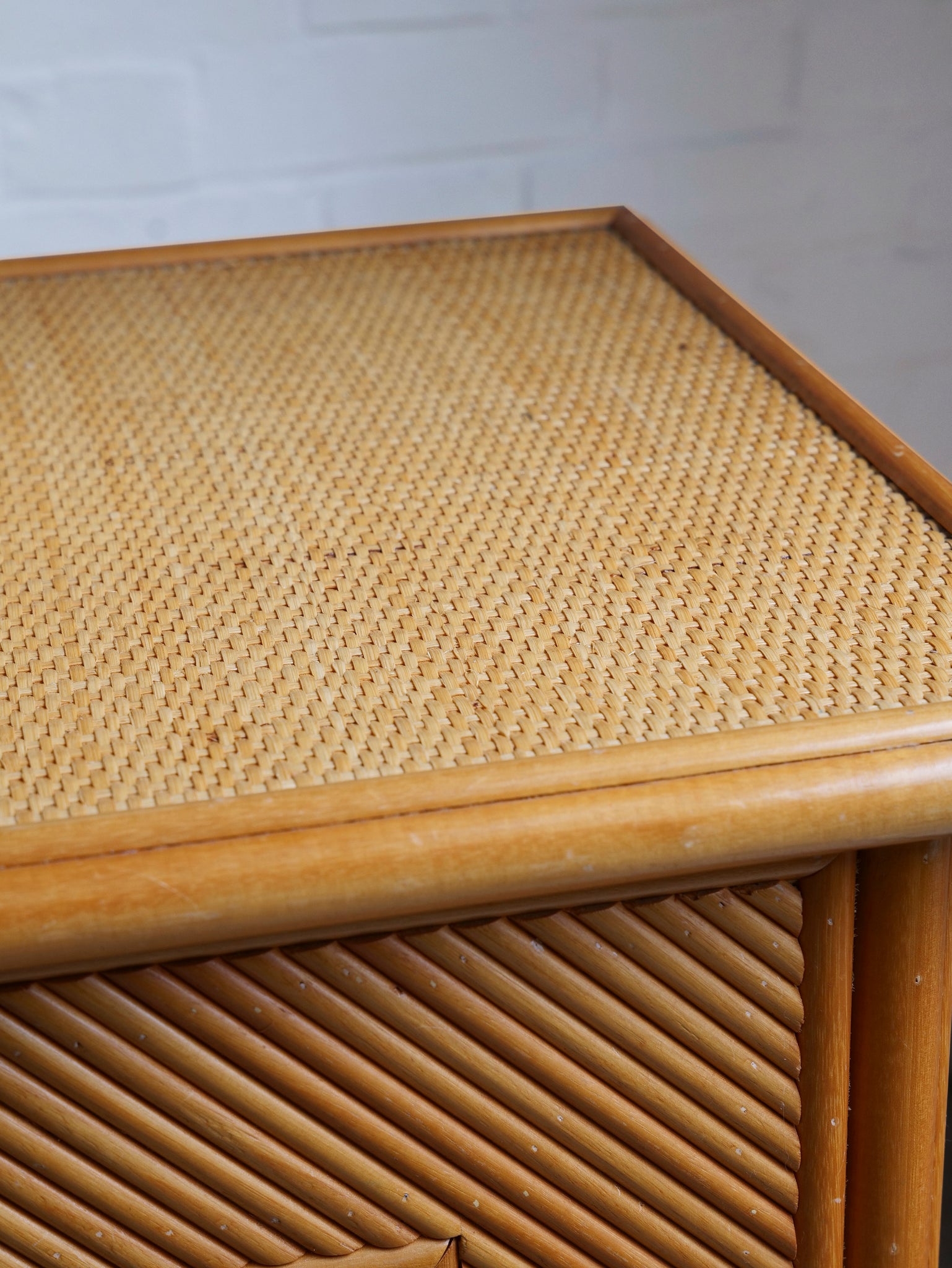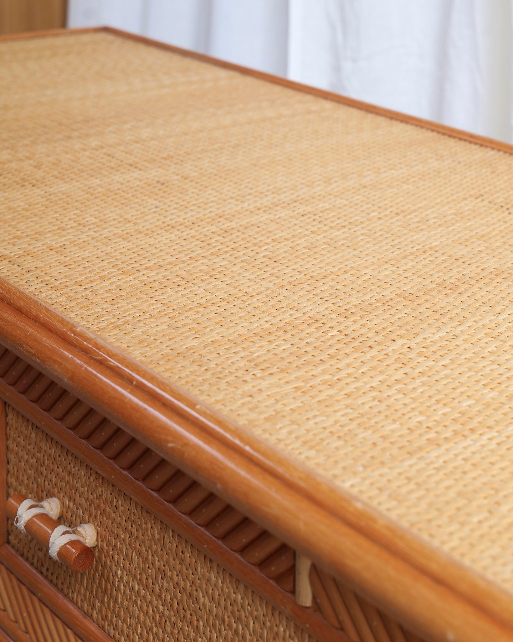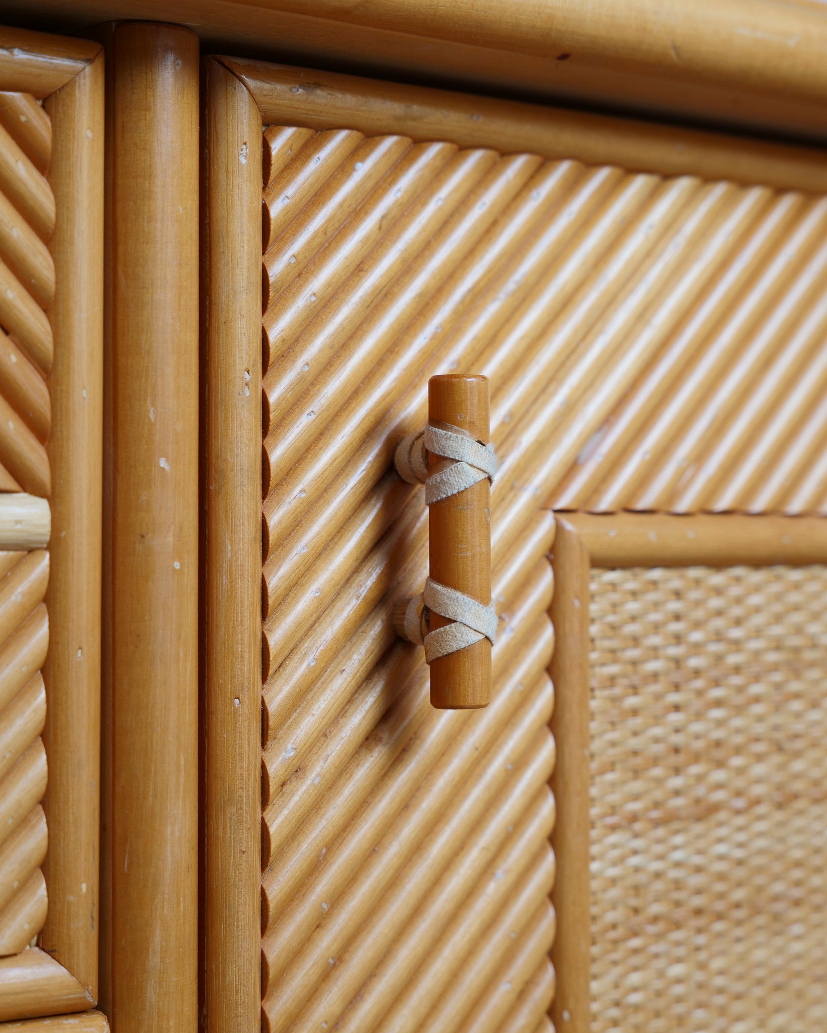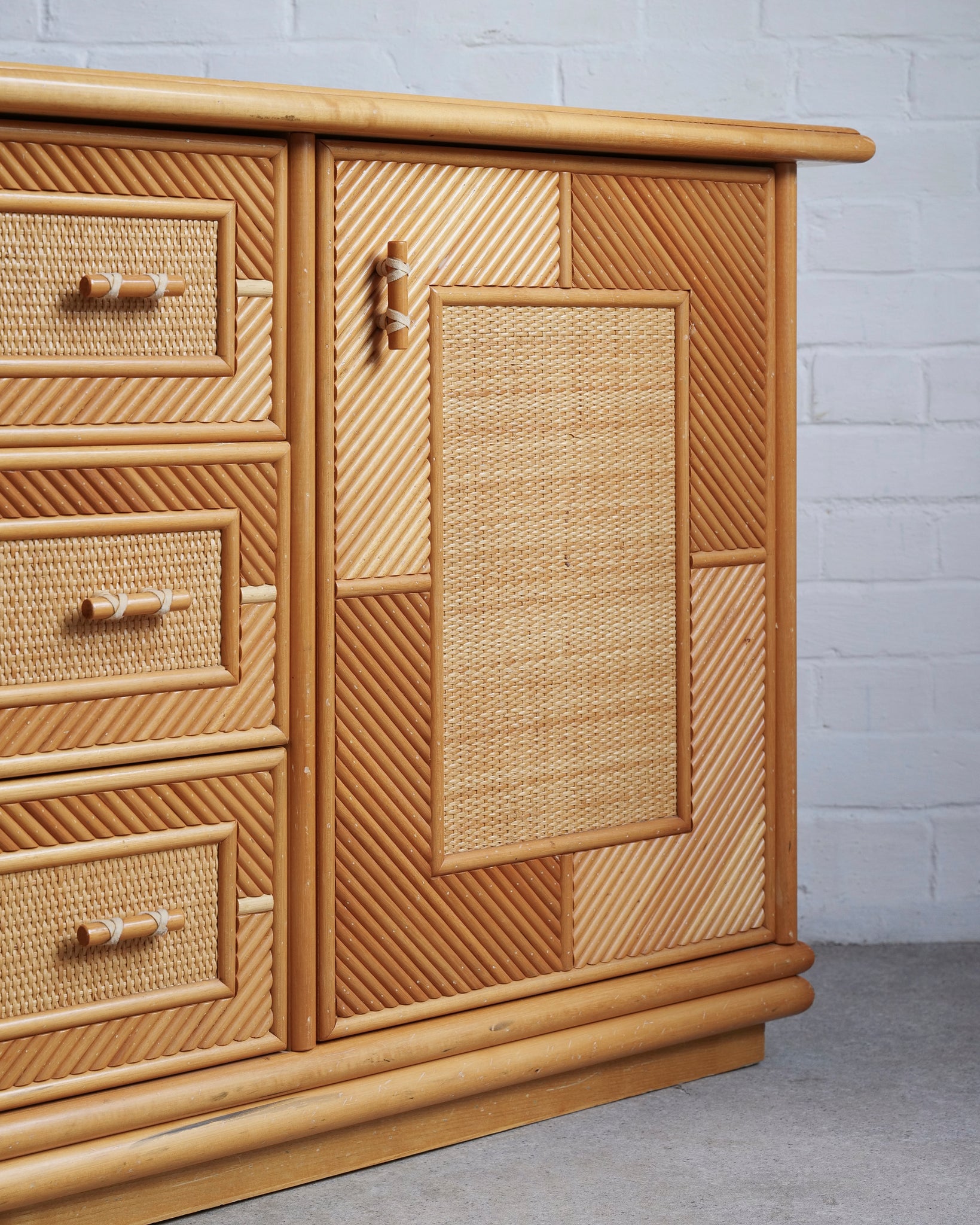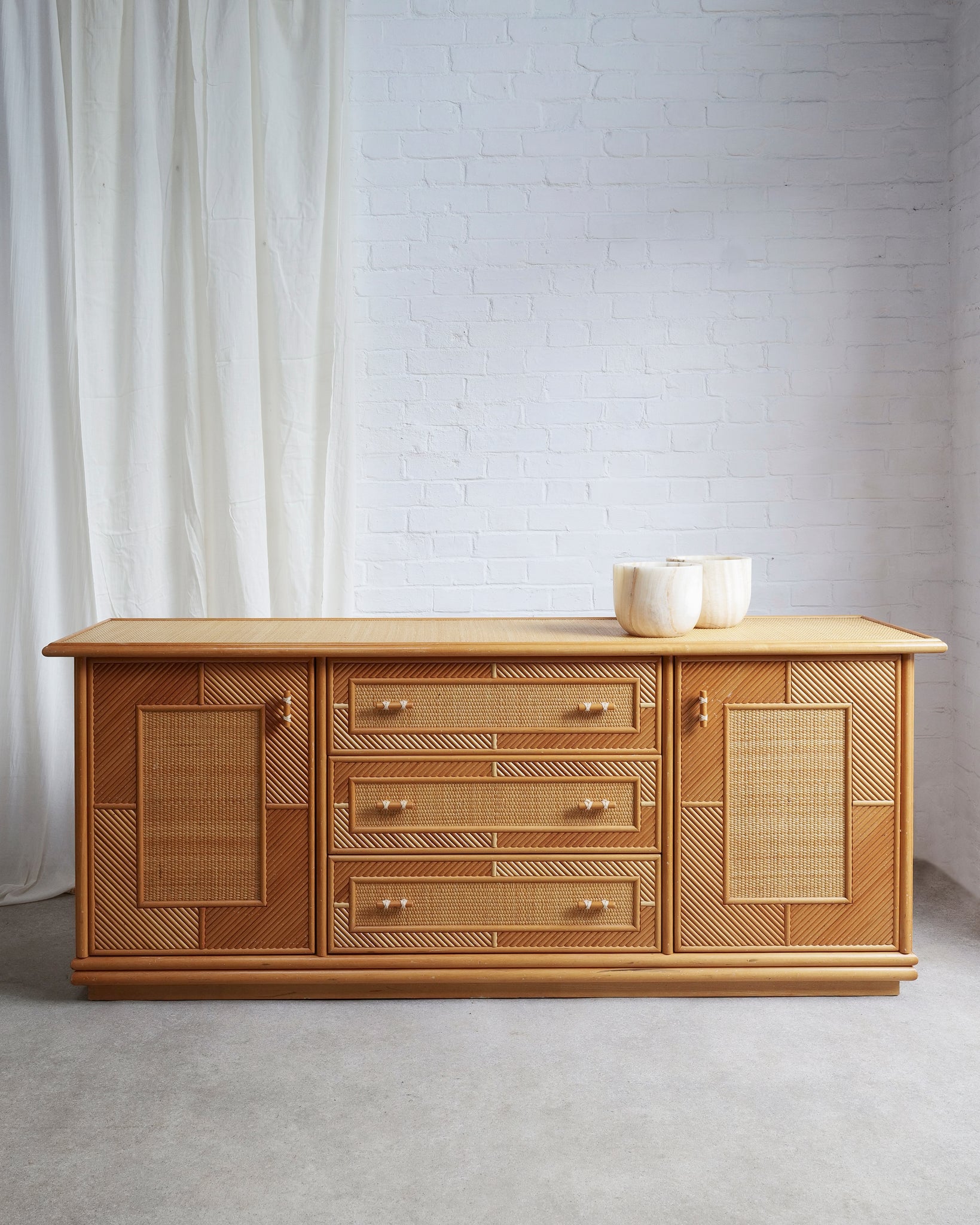 An incredible patchwork effect sideboard with a mixture of chunky pencil reed and cane.