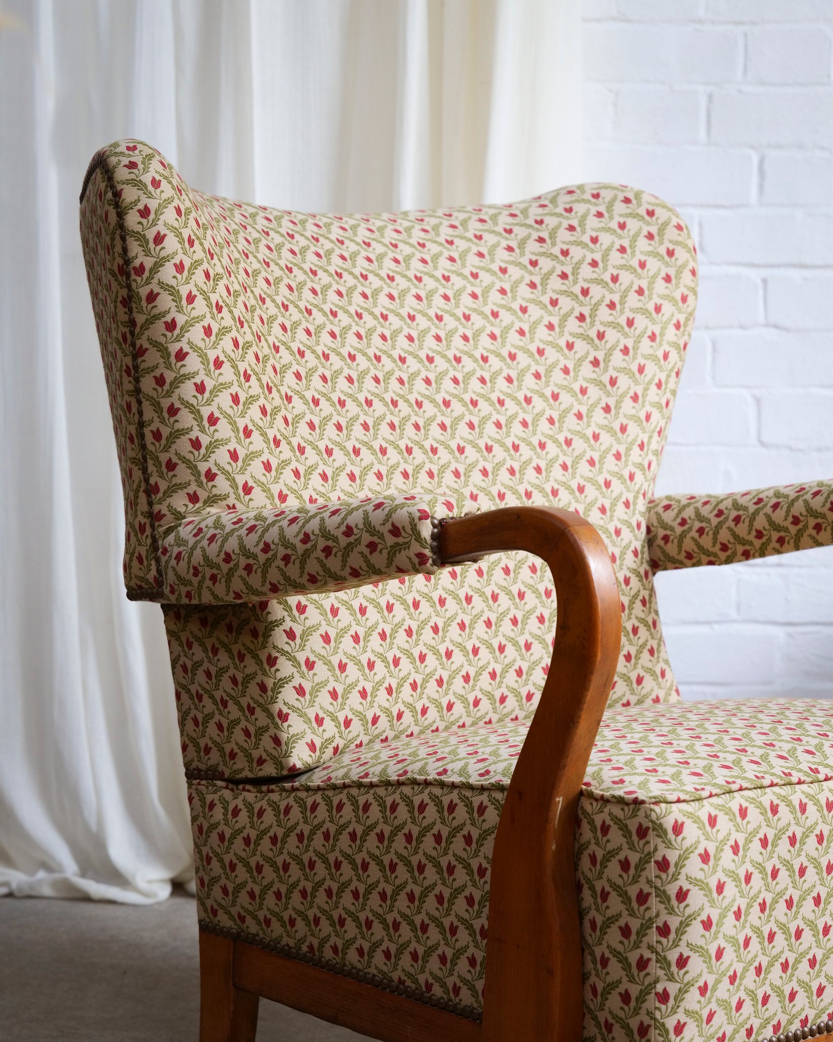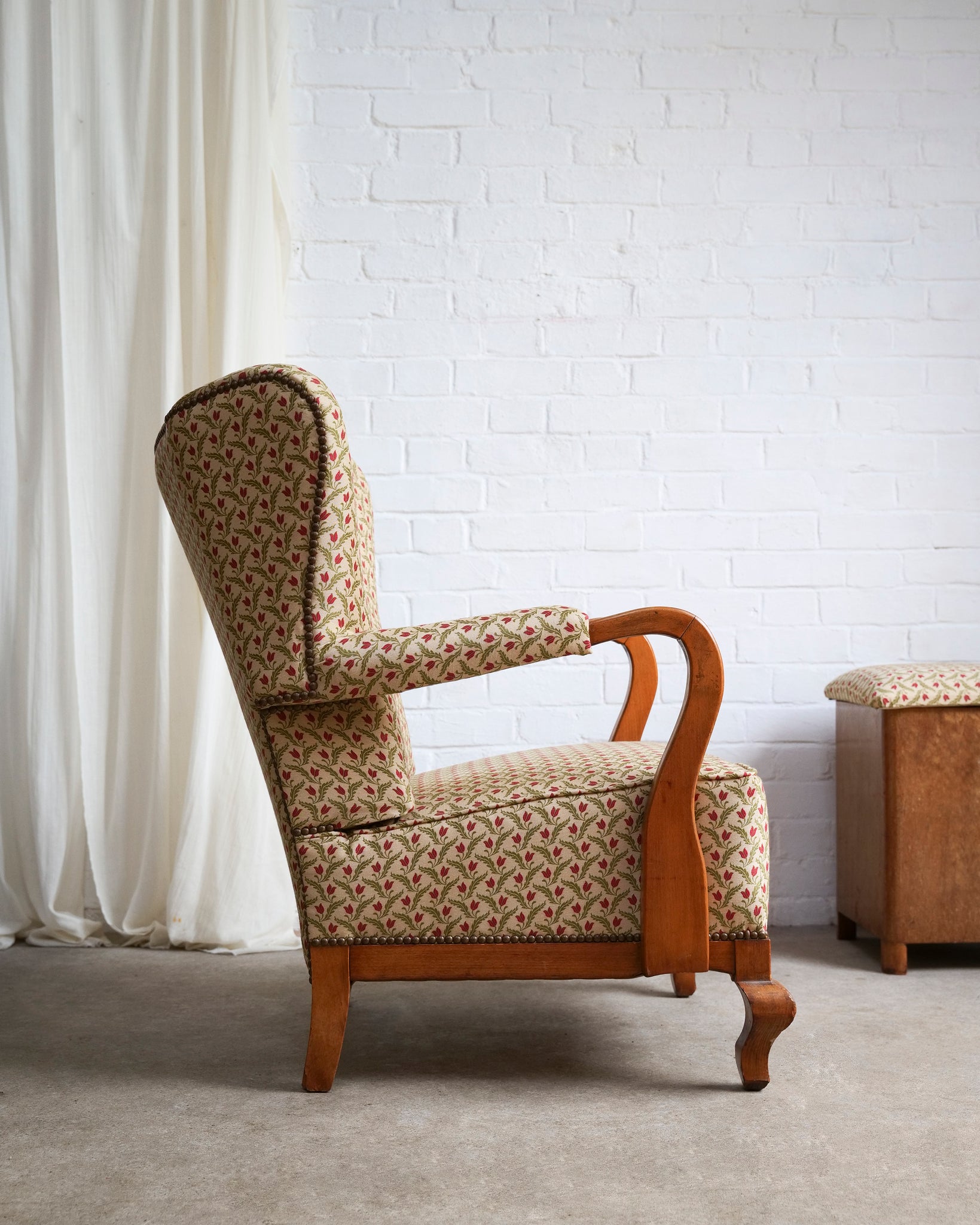 A beautiful wingback walnut armchair with immaculate tulip floral Upholstery.