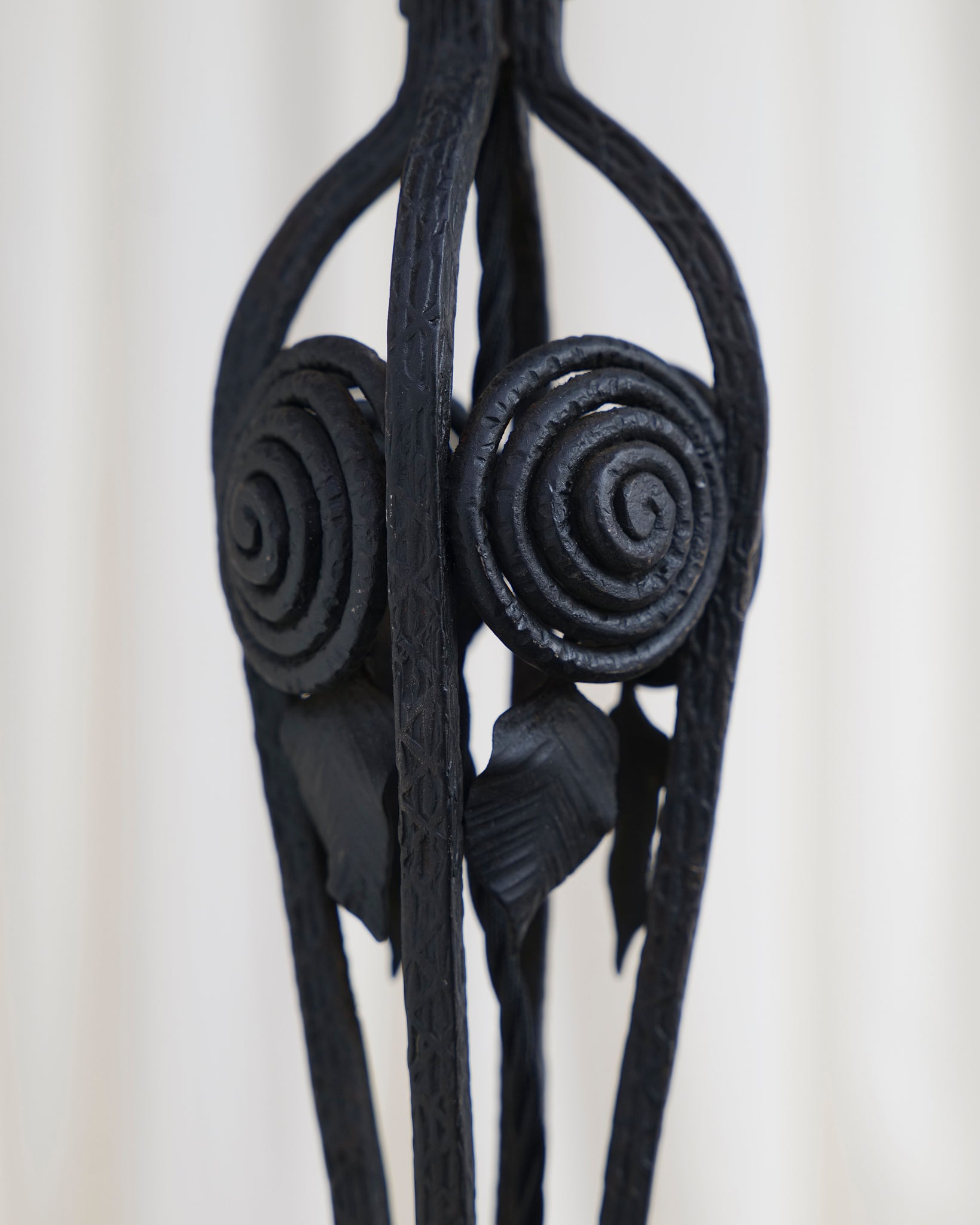 The base is made up of four hammered iron spirals, a pattern which is repeated toward the top of the lamp, finished off with delicate leaves.