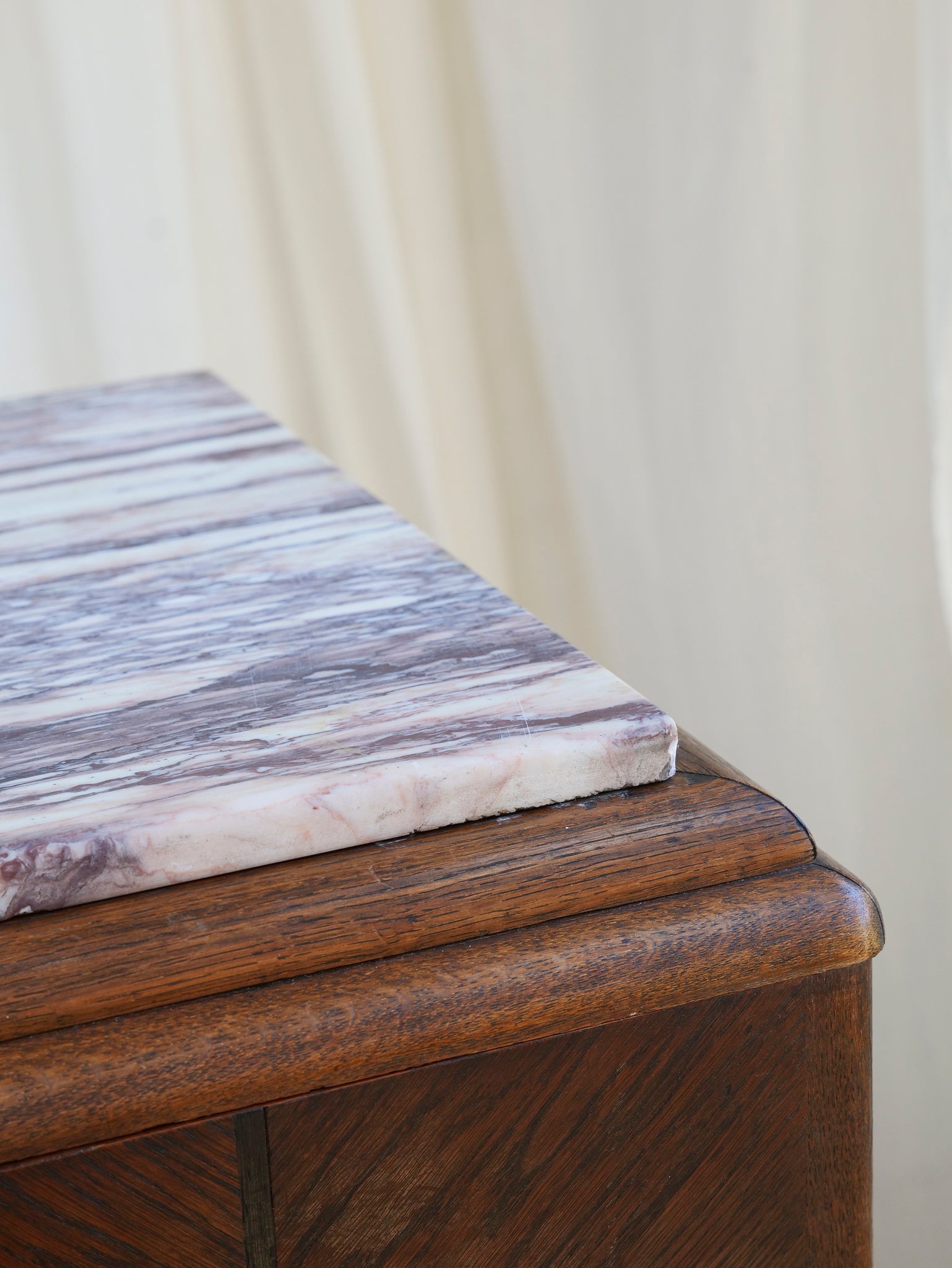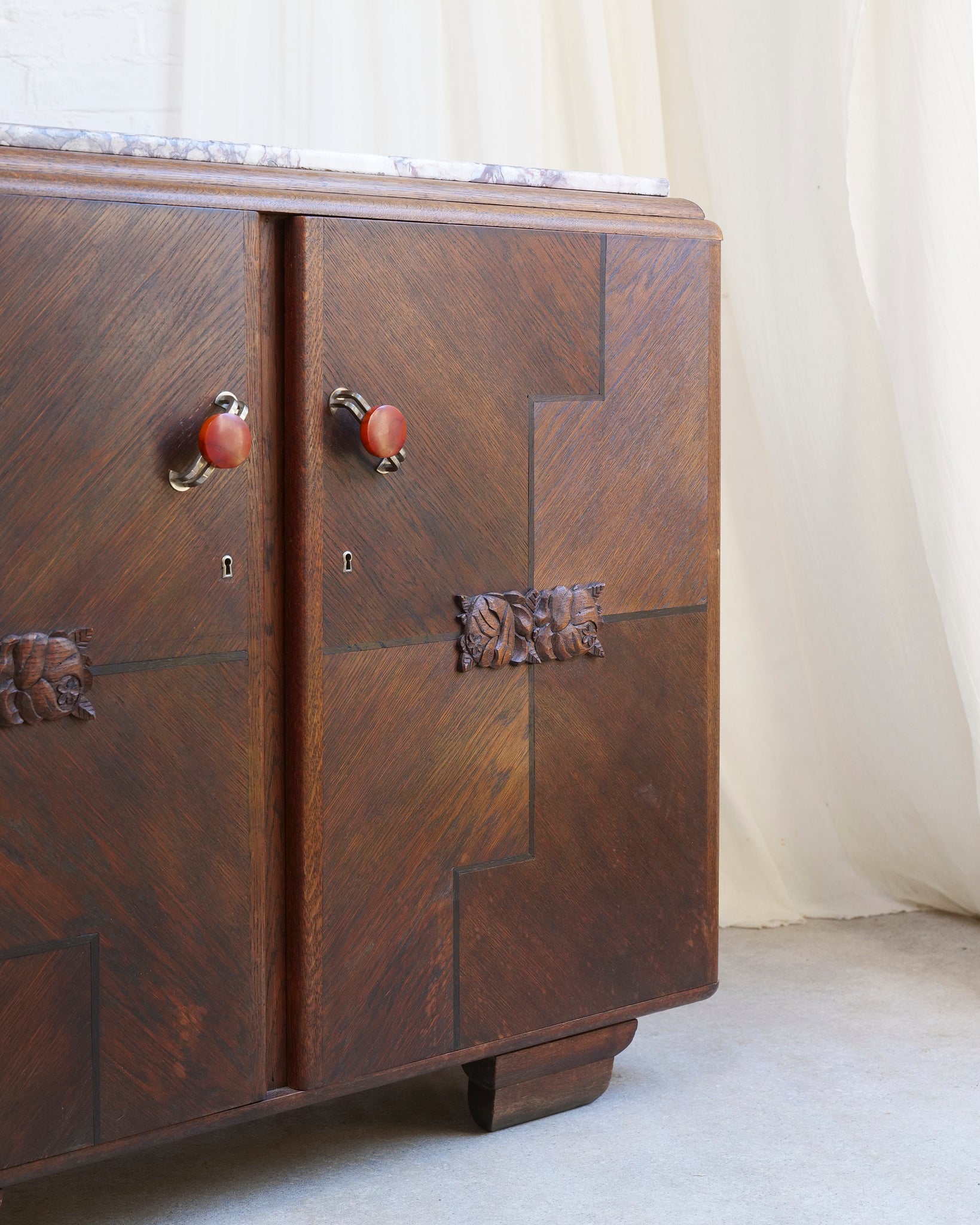 A beautiful art deco small sideboard with original red Bakelite handles and beautiful purple veined and white marble top .