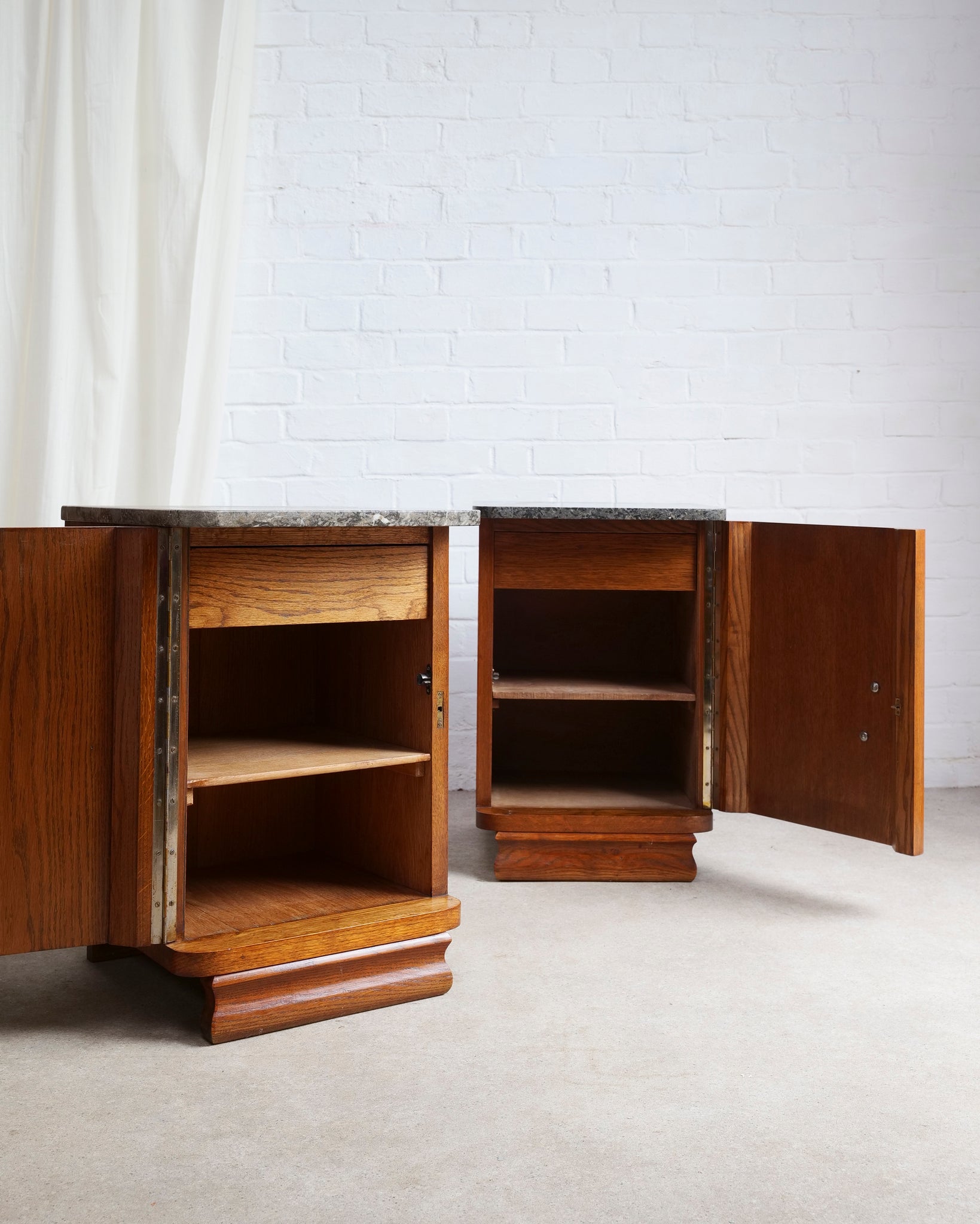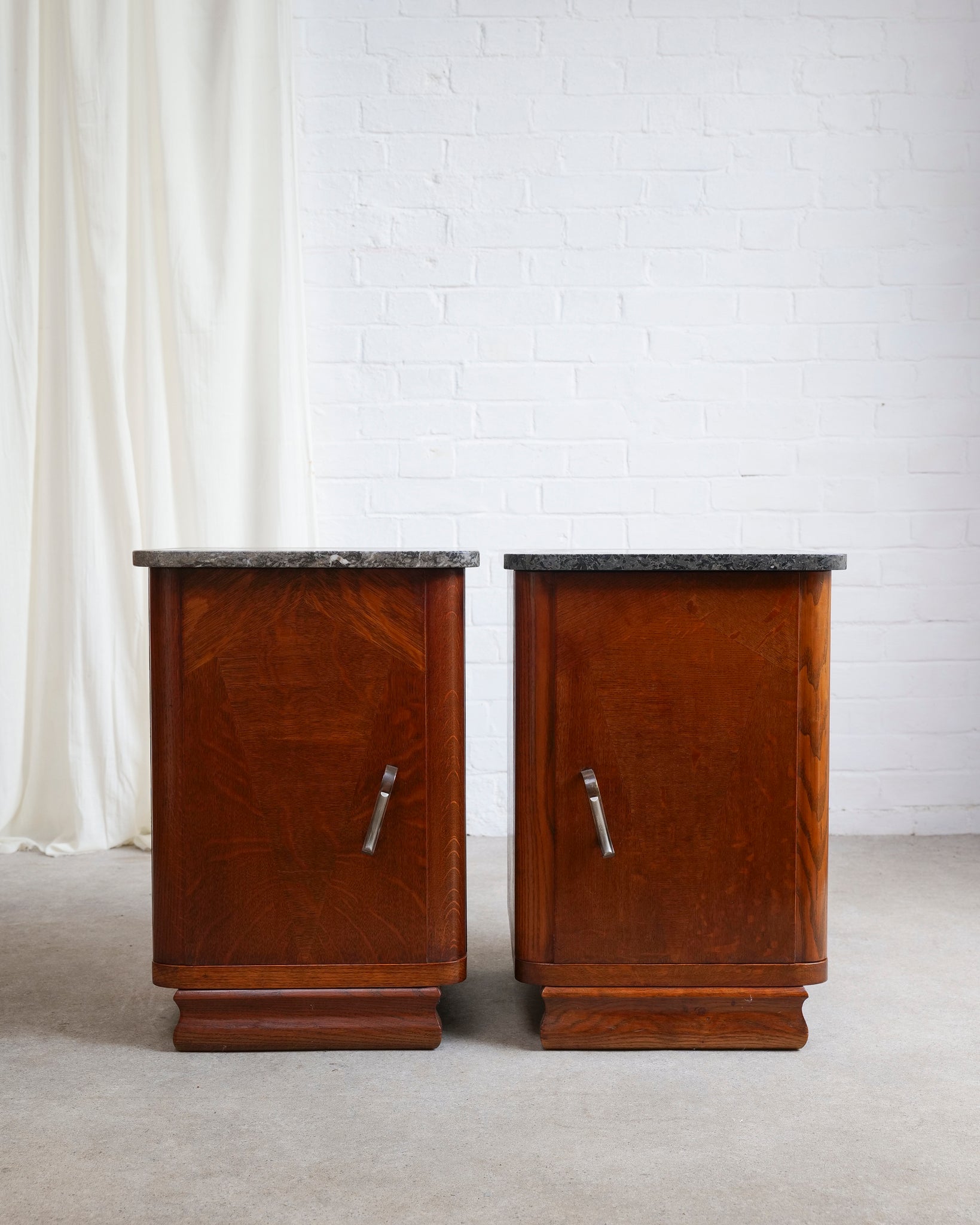 Stunning set of Art Deco bedside tables. We have recently had these restored, so the wood has gained a beautiful lustre, really showing off the marquetry detail on the doors.