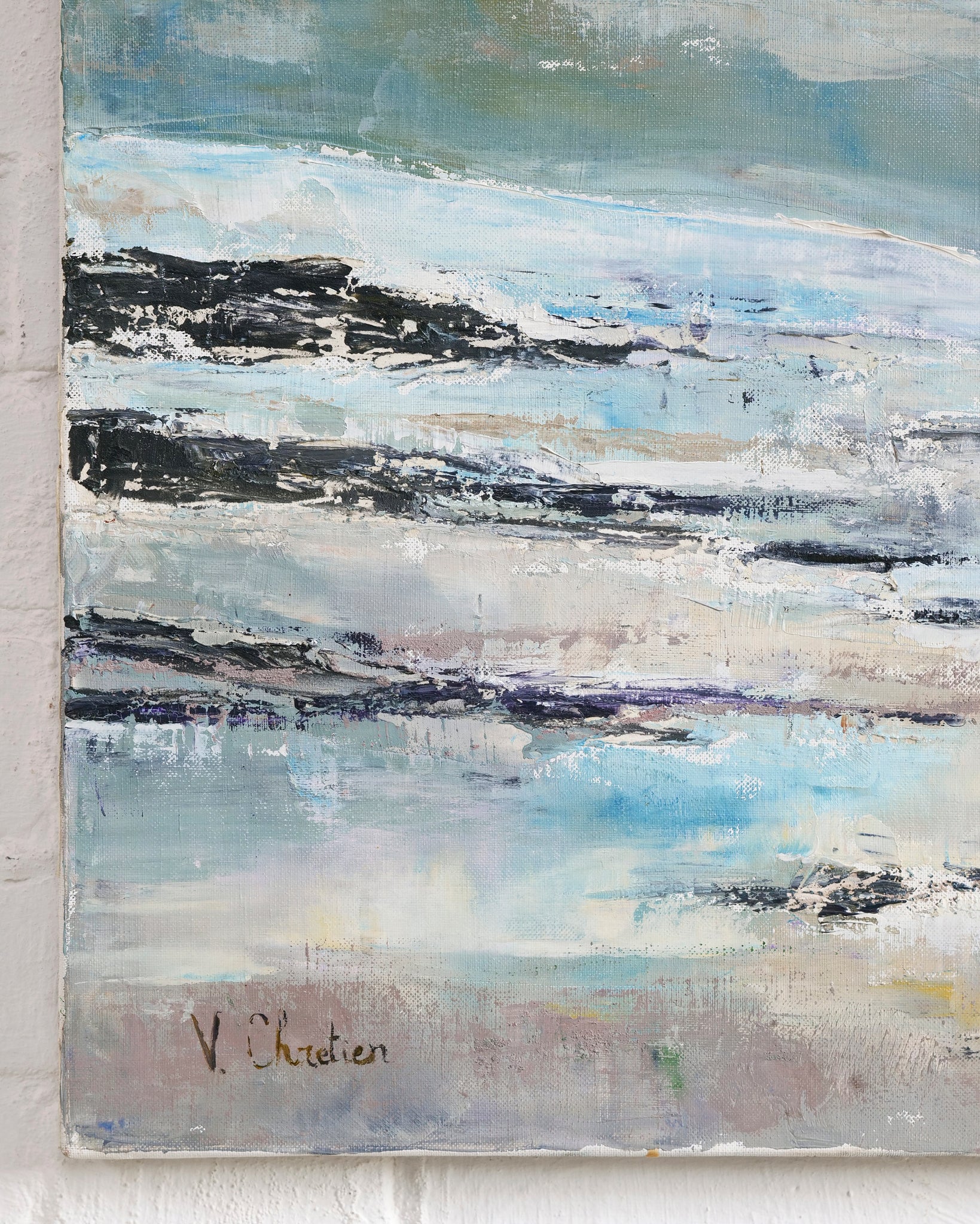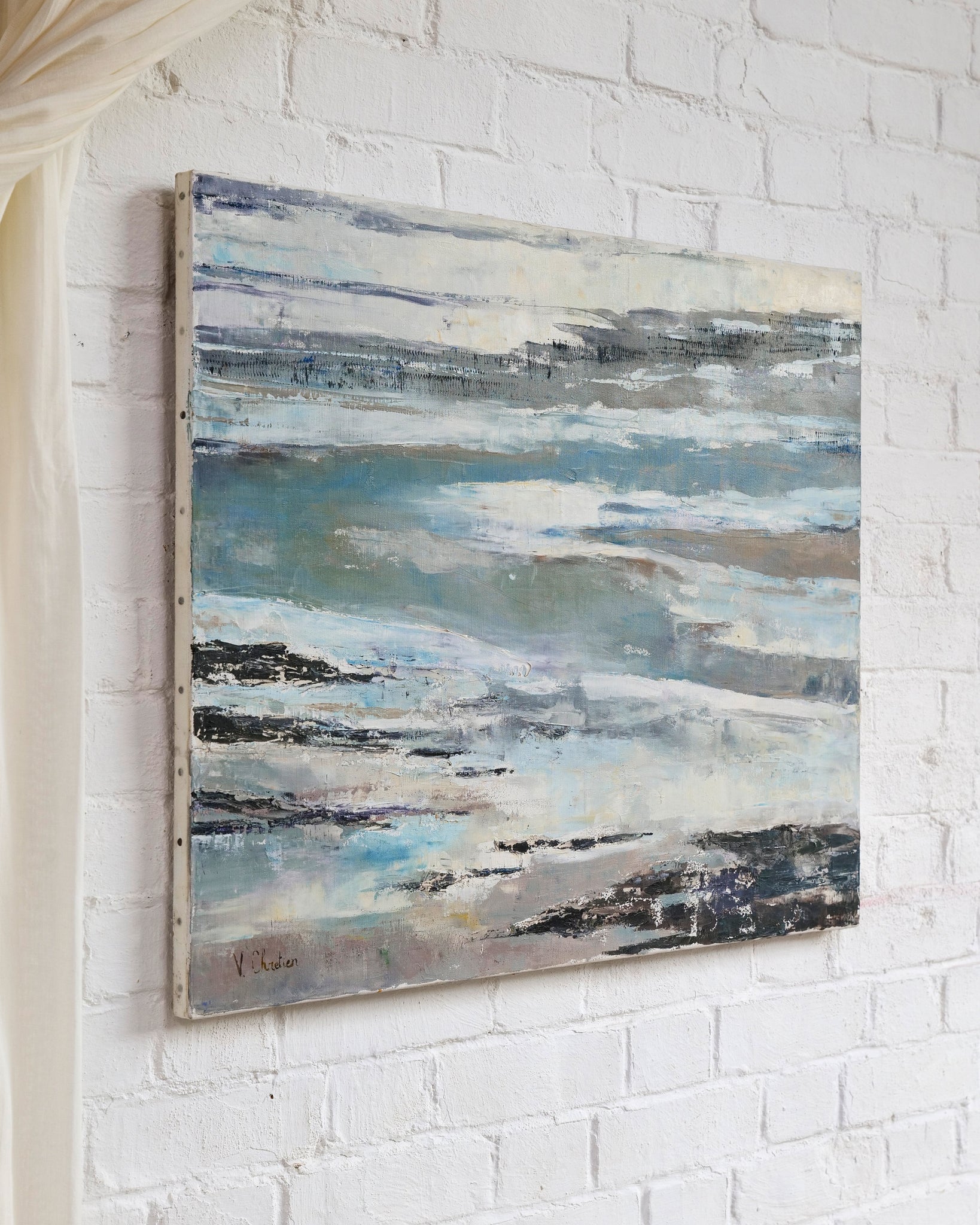 This piece uses tones of blues and whites to create a textural abstract scene.